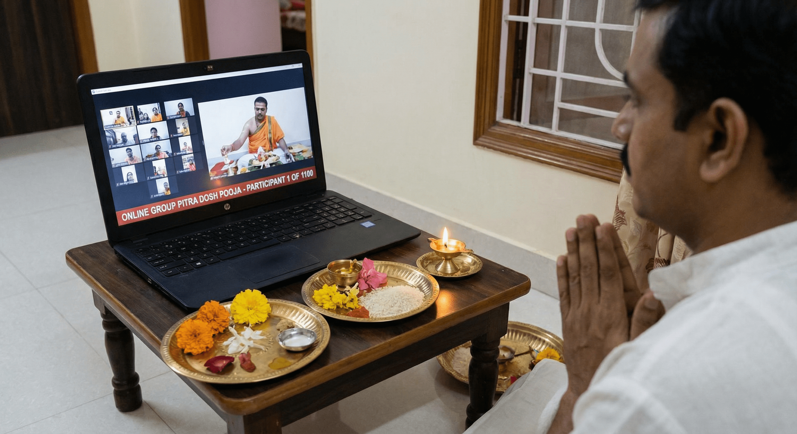 • You receive a live video link (Zoom / Meet / WhatsApp / etc.) for the scheduled pooja.