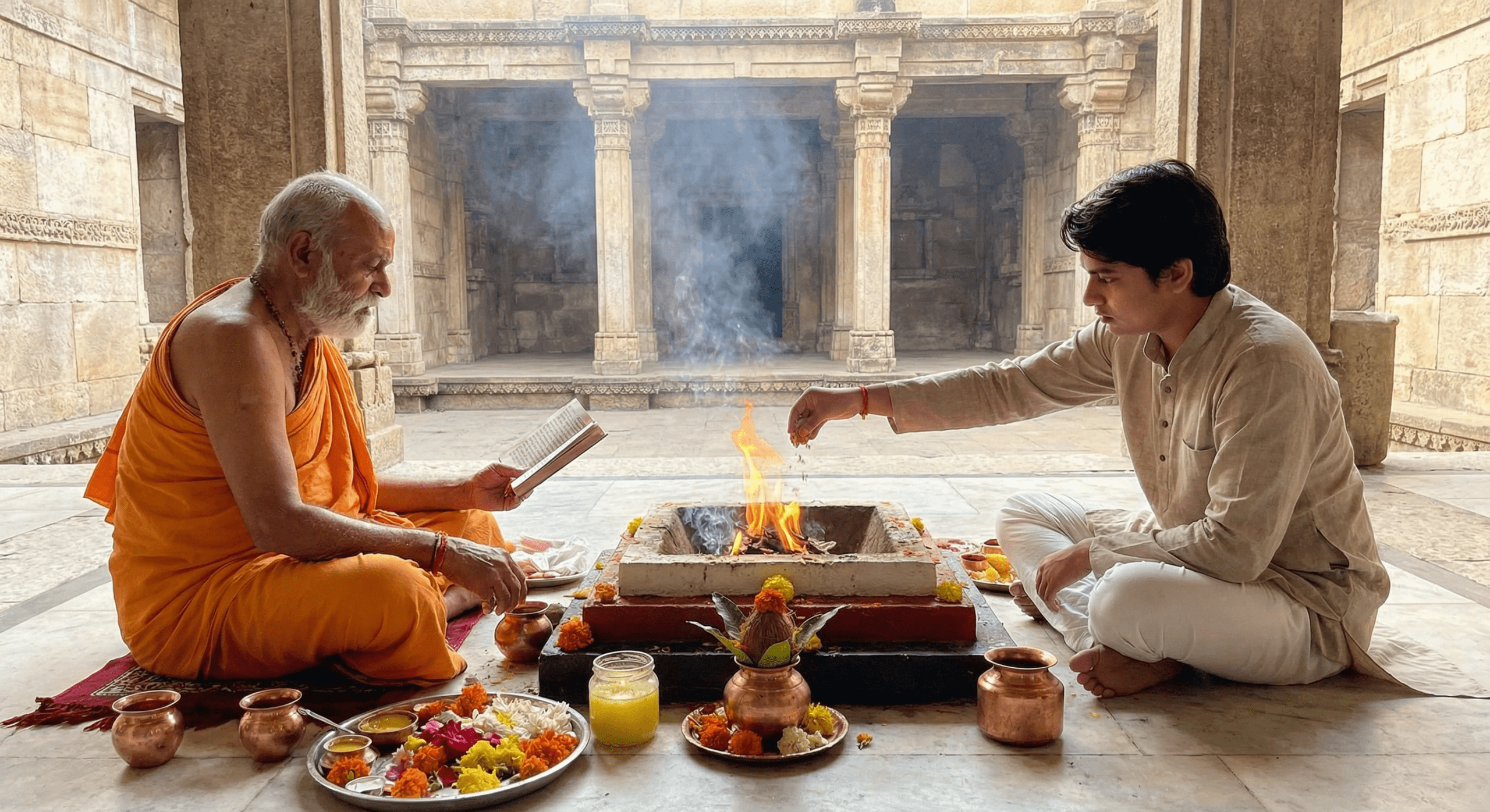 - Personal Sankalp – Your name, gotra and basic details are recited in front of the sacred fire, stating your specific intention (marriage, relationship harmony, peace of mind, etc.).
